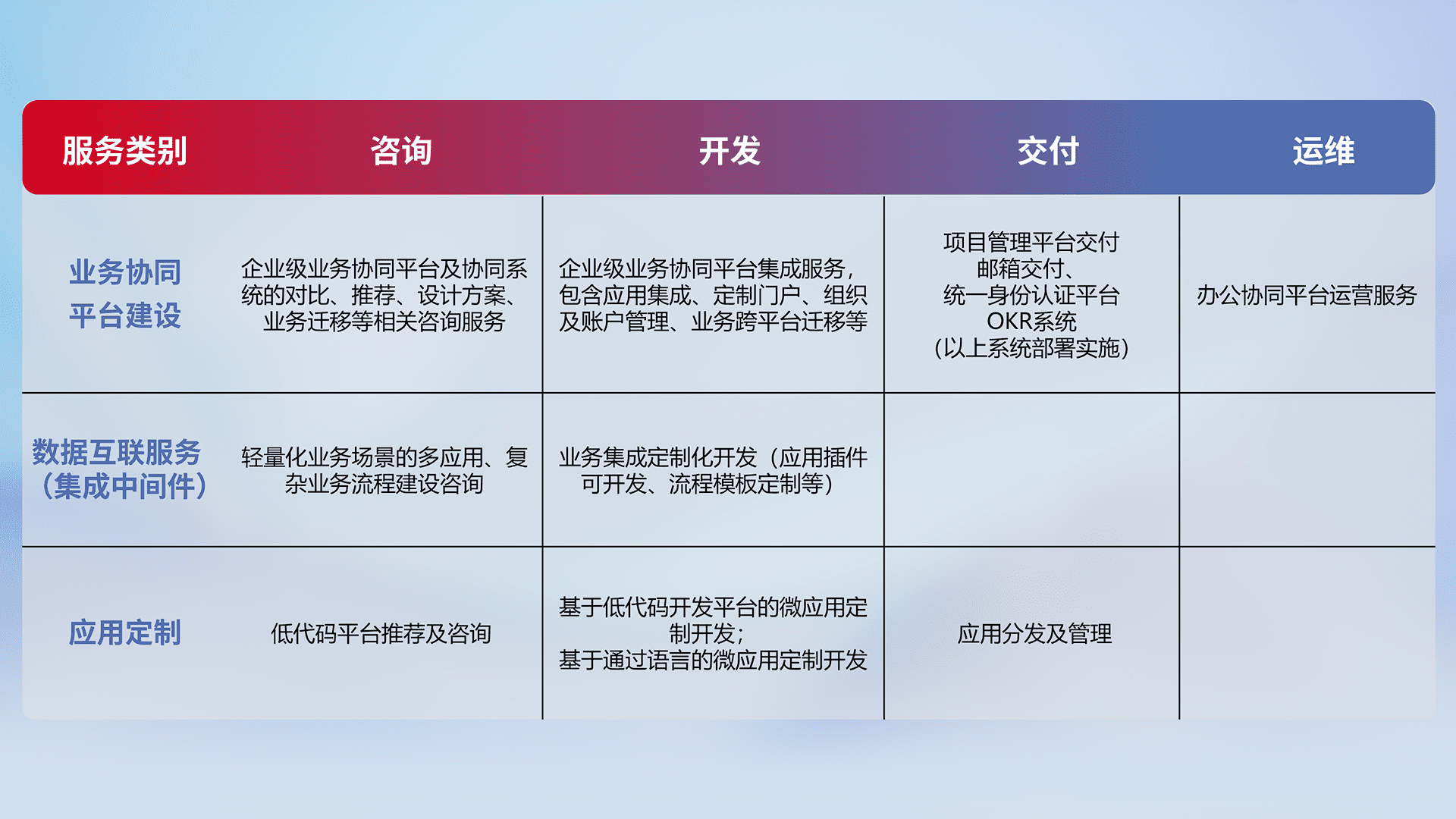 针对钉钉、、、企微、、、IDaas等平台级产品提供产品的规划、、、、方案、、、、交付、、、定制化开发等服务,,实现如统一协同办公、、智能客户服务、、、混合会议管理、、、智能数据查询、、、、等业务场景,,,,实现数字化转型。。。。