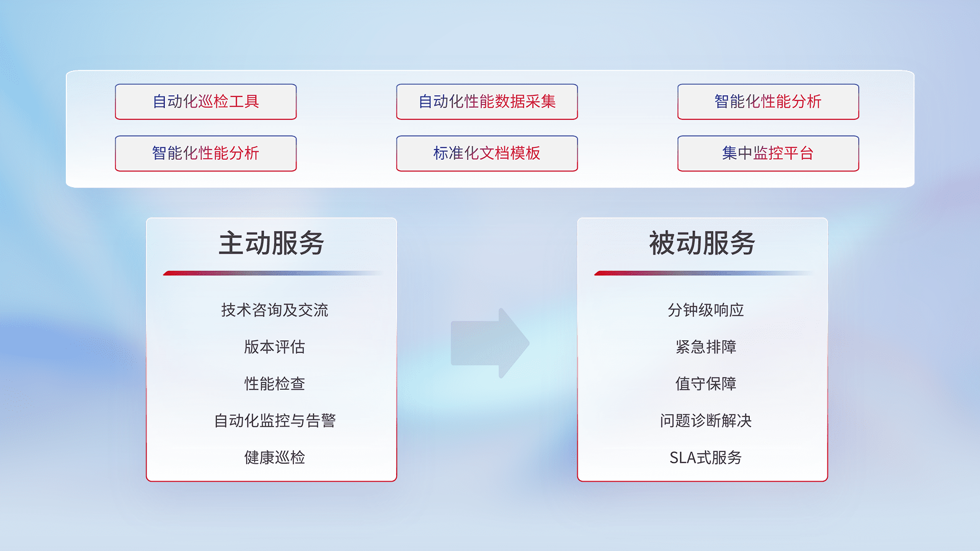 智能化工具和标准化文档,,,,保障服务质量,,,提供主动服务(包含技术咨询、、版本评估、、性能检查、、、、自动化监控与告警、、健康巡检)和被动服务包含(分钟级响应、、紧急排障、、、值守保障、、、、问题诊断解决、、、SLA服务)。。。